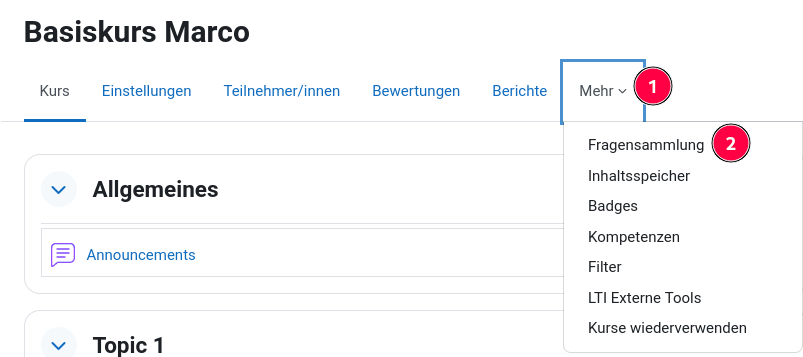 Jeder Kurs besitzt eine Fragesammlung. Werden Fragen in einem Kurs erstellt, dann sind sie nicht automatisch in den anderen Kursen vorhanden!