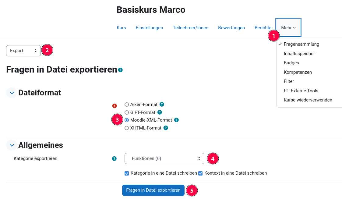 - Bei Kategorie Oberste für "Kursname" werden immer alle Fragen exportiert.