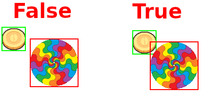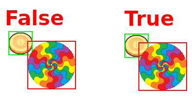 Im obigen Beispiel wird eine Kollision festgestellt, wenn sich die den Objekten zu Grunde liegenden Rechtecke überschneiden. Eine kleine Anpassung des Bauplans, d.h. der Klassen, genügt, um erst bei einer effektiven Bildüberschneidung eine Kollision zu melden. Kurz: "Melde erste eine Kollision, wenn sich die Pixel der jeweiligen Objekte überlappen."