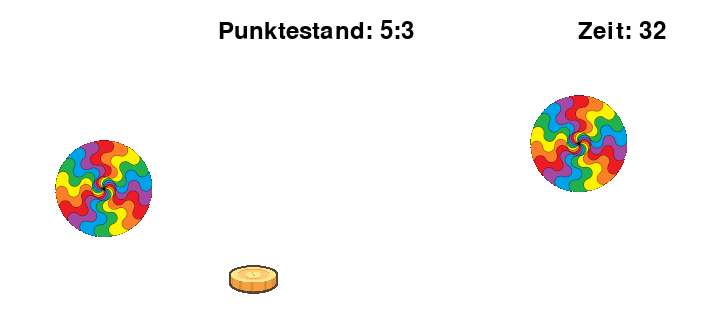 Die Spieler sollen die Münze einfangen. Wer sie zuerst berührt, der erhält einen Punkt. Eine neue Münze soll wiederum zufällige irgendwo auf dem Bildschirm auftauchen. Das Testen einer Berührung, sprich einer Kollision, muss natürlich in der Hauptschleife geschehen. Zwecks Übersichtlichkeit lagern wir diese Funktionalität, Kollision überprüfen, in eine Funktion aus und rufen die Funktion in der Hauptschleife dann auf.